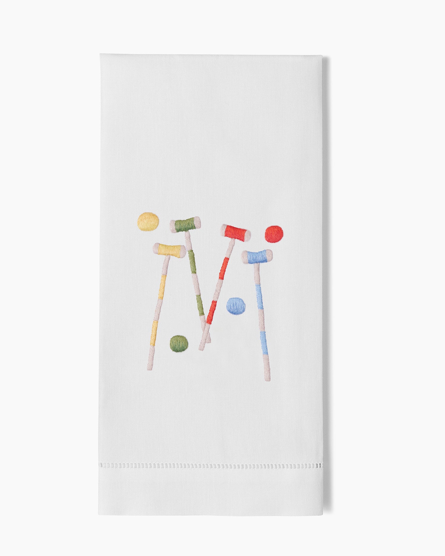 Add playful charm to your kitchen with this cotton hand towel, featuring hand-embroidered croquet mallets and balls. Soft, colorful, and perfect for game enthusiasts.