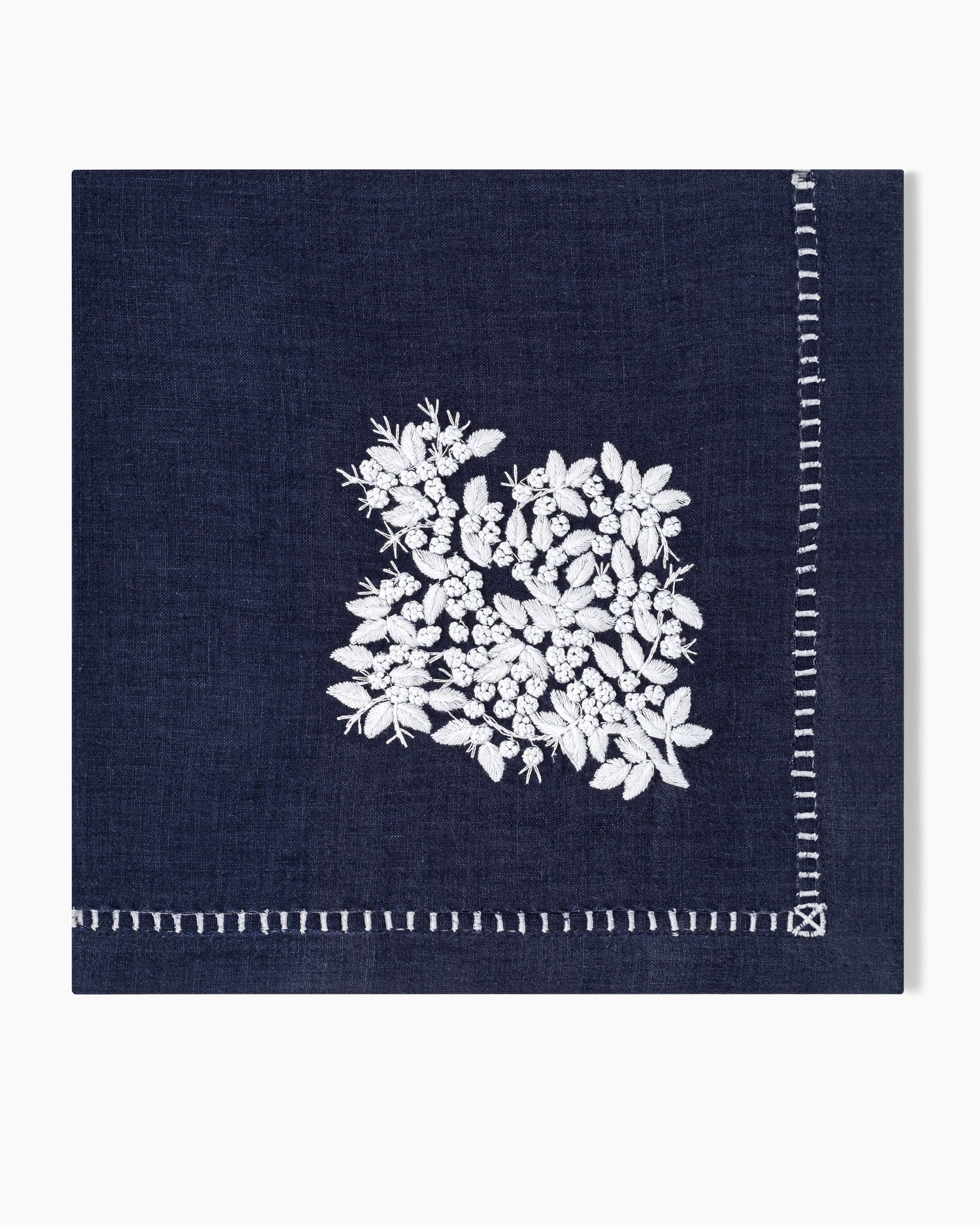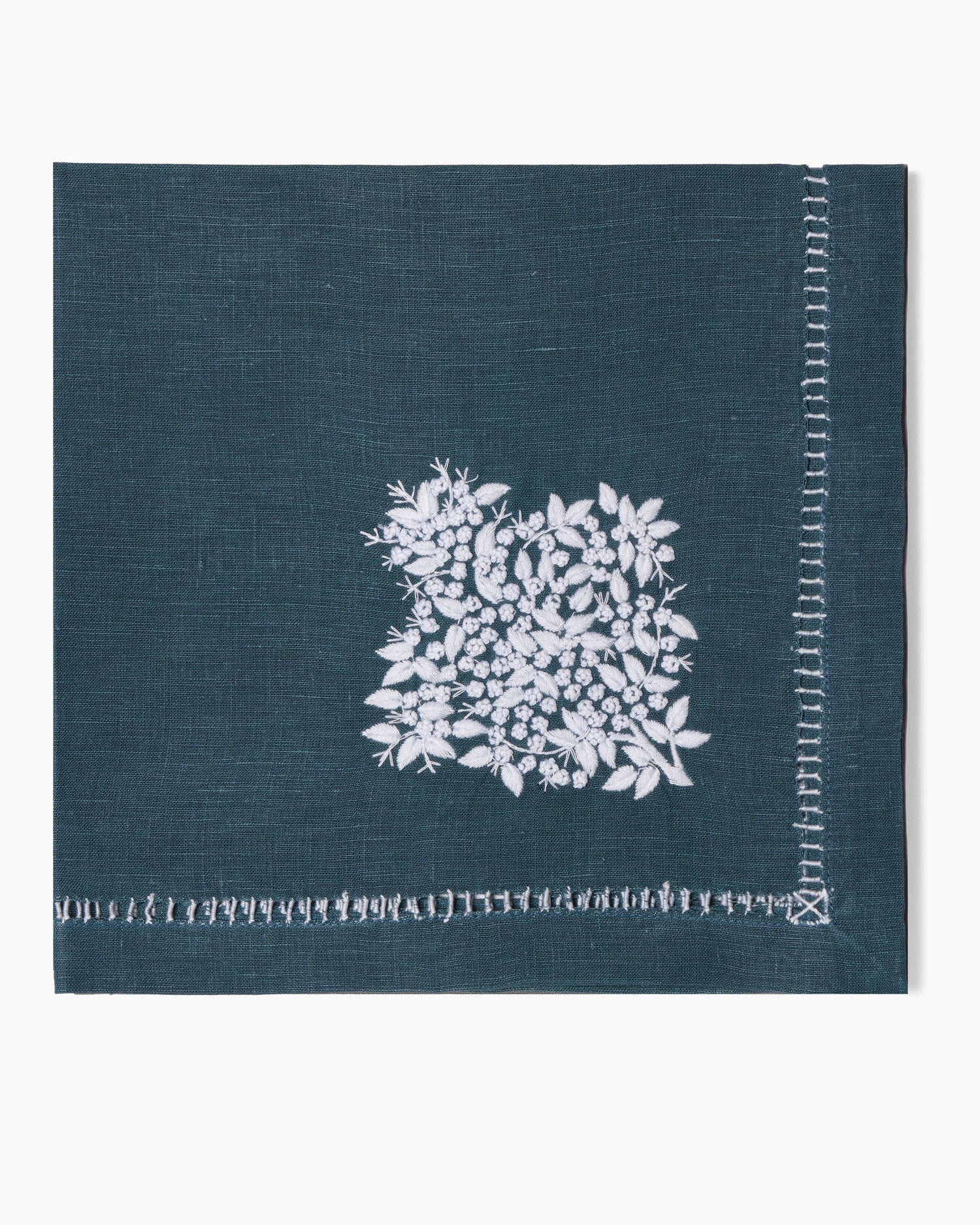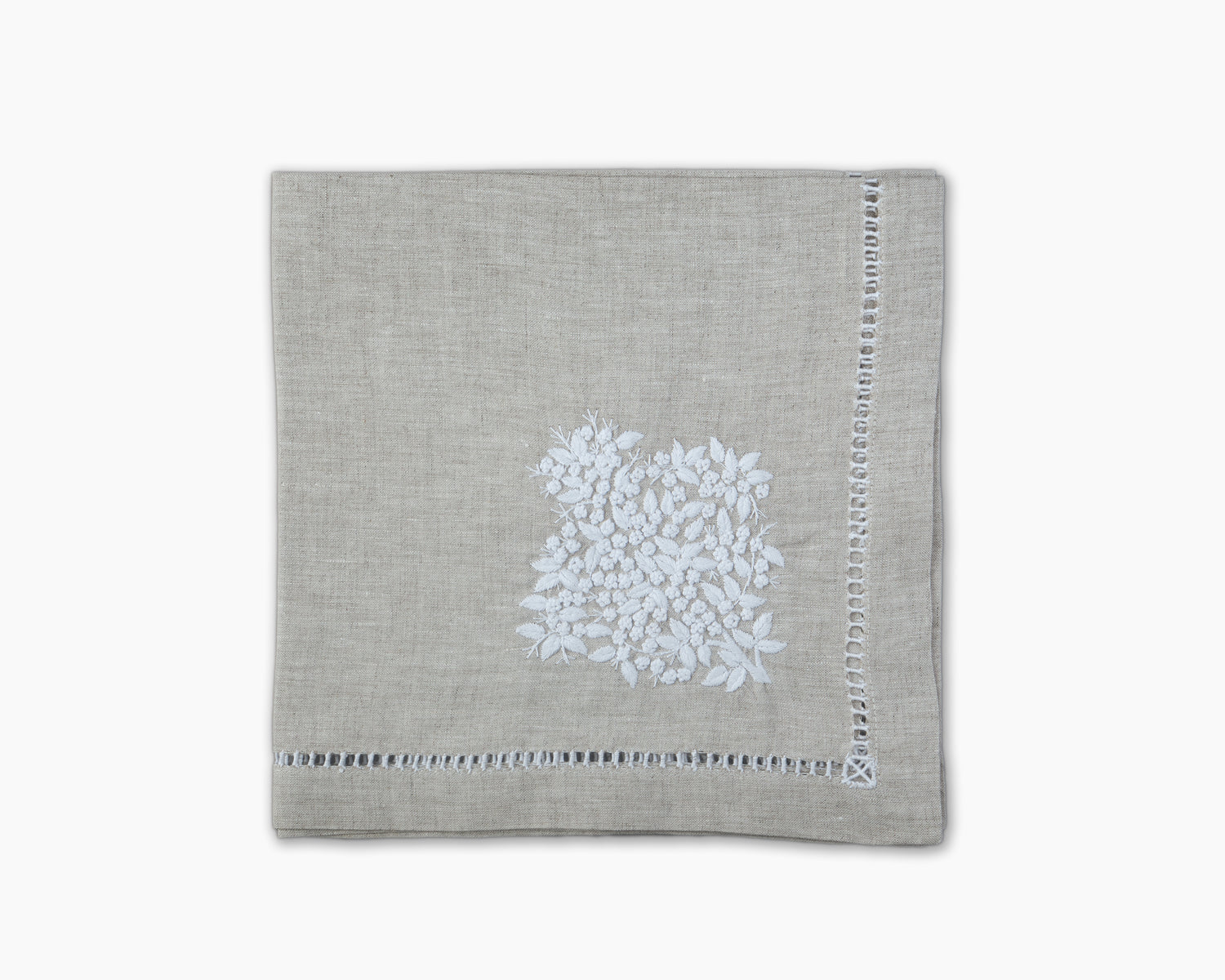 A quintessential addition to the Jardin Classic table, the dinner napkin displays an exquisite French knot floral pattern hand embroidered in white thread on five different colors of pure Italian linen.