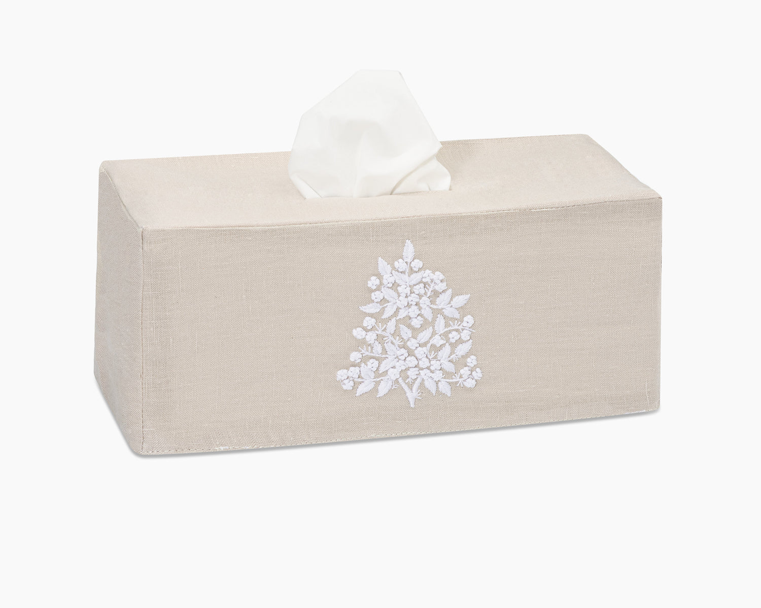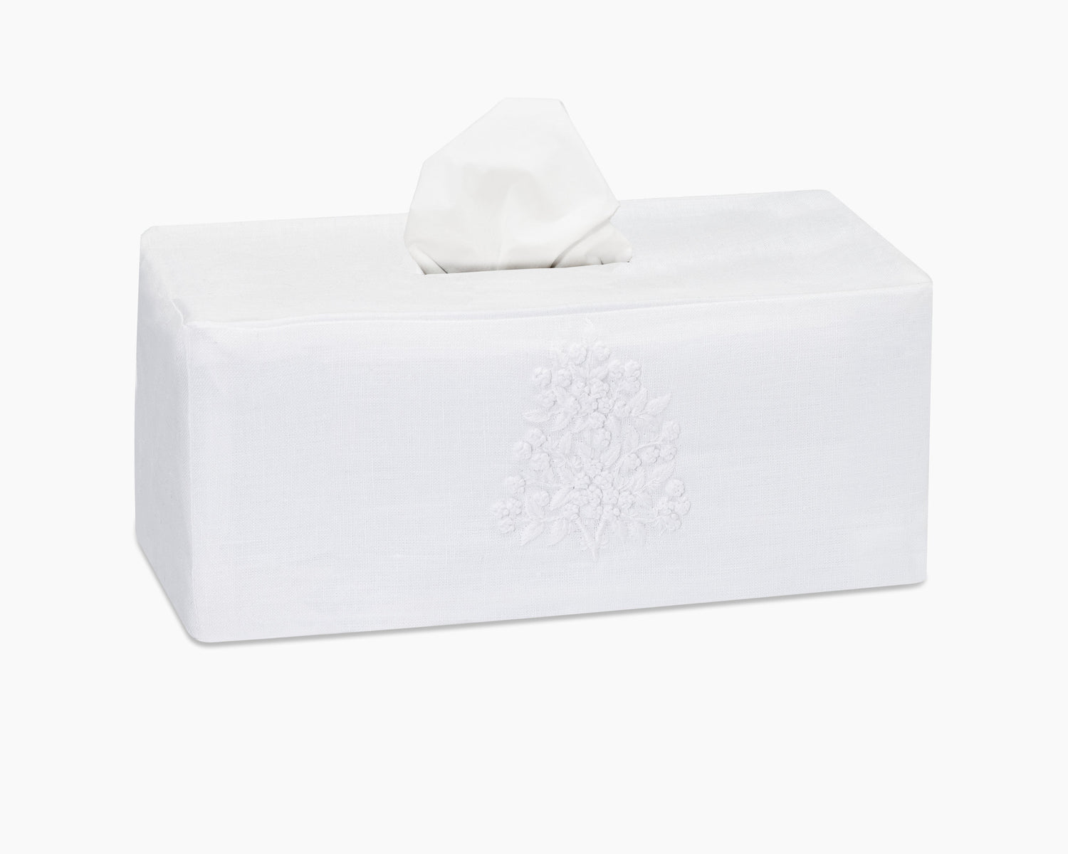 Add a touch of grace with this classic tissue box cover. The Jardin Classic is a French knot floral pattern hand embroidered in white thread on five different colors of pure Italian linen.