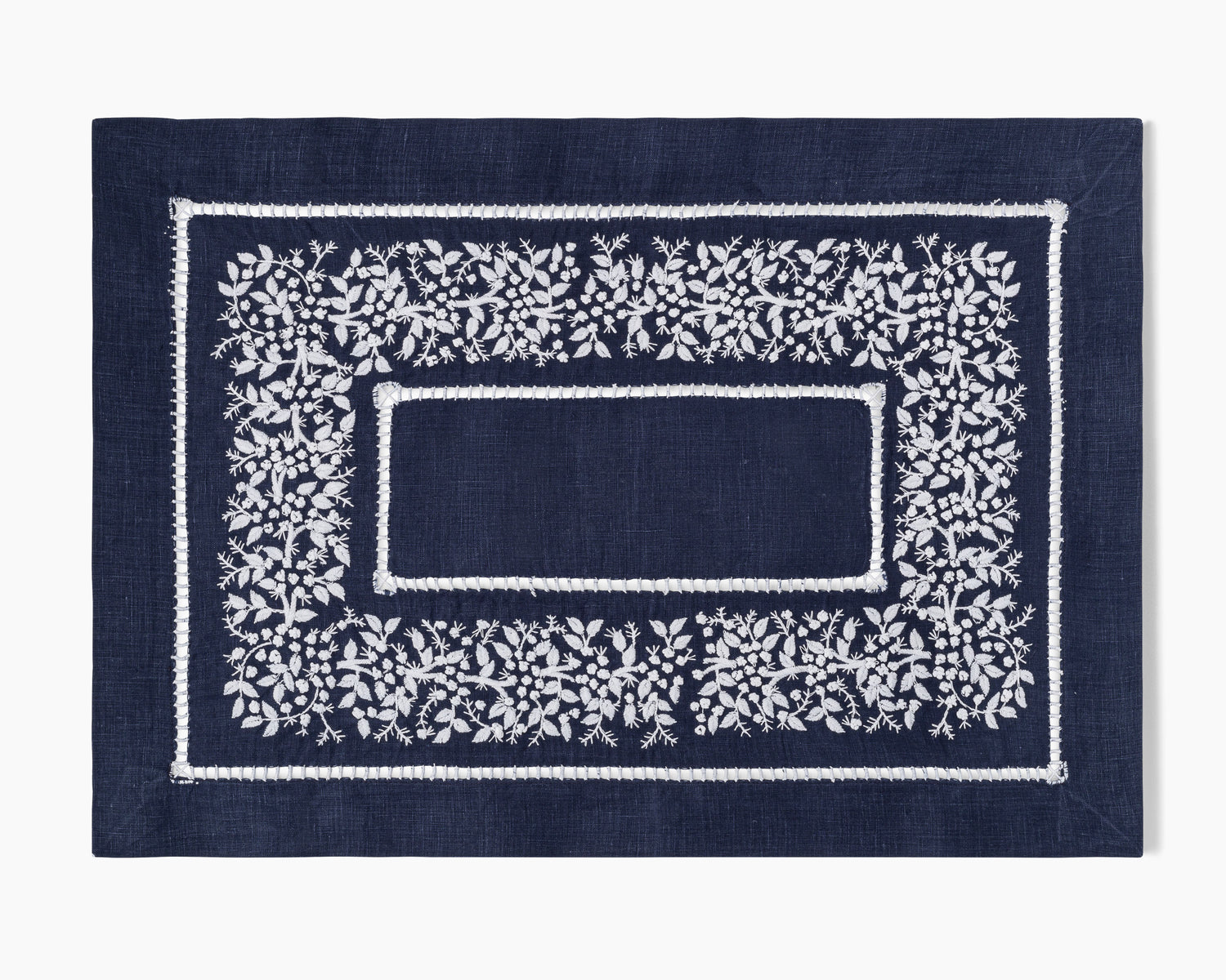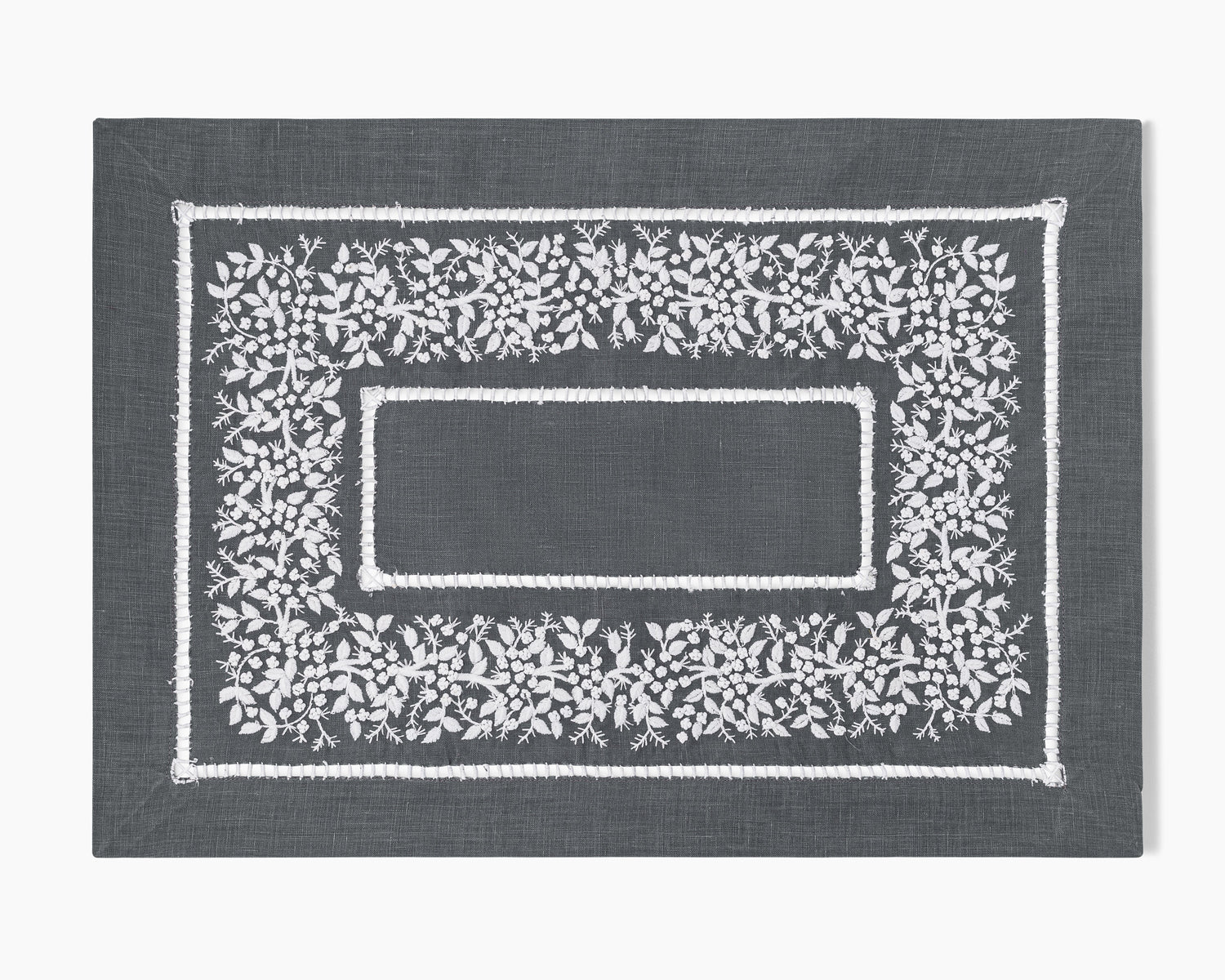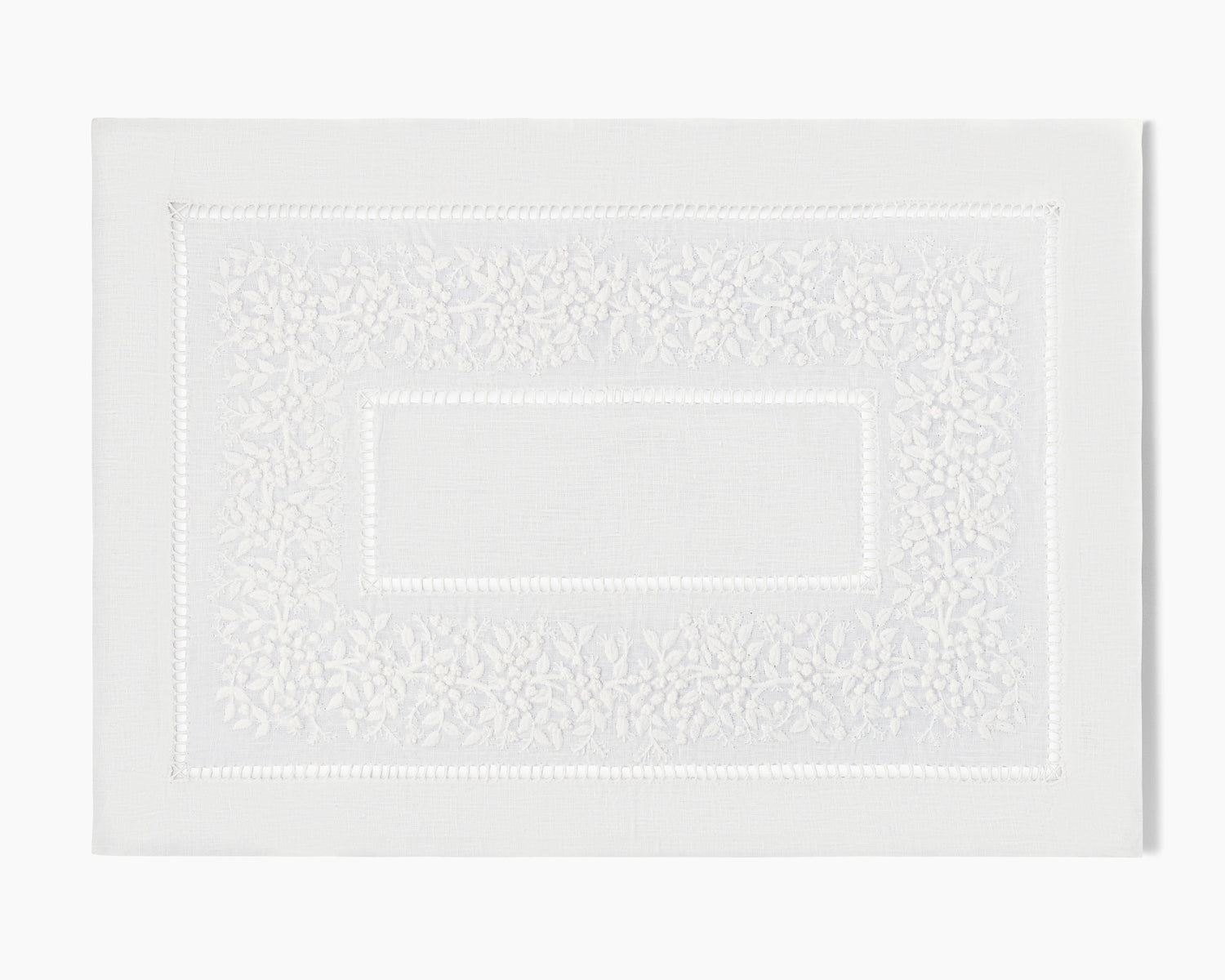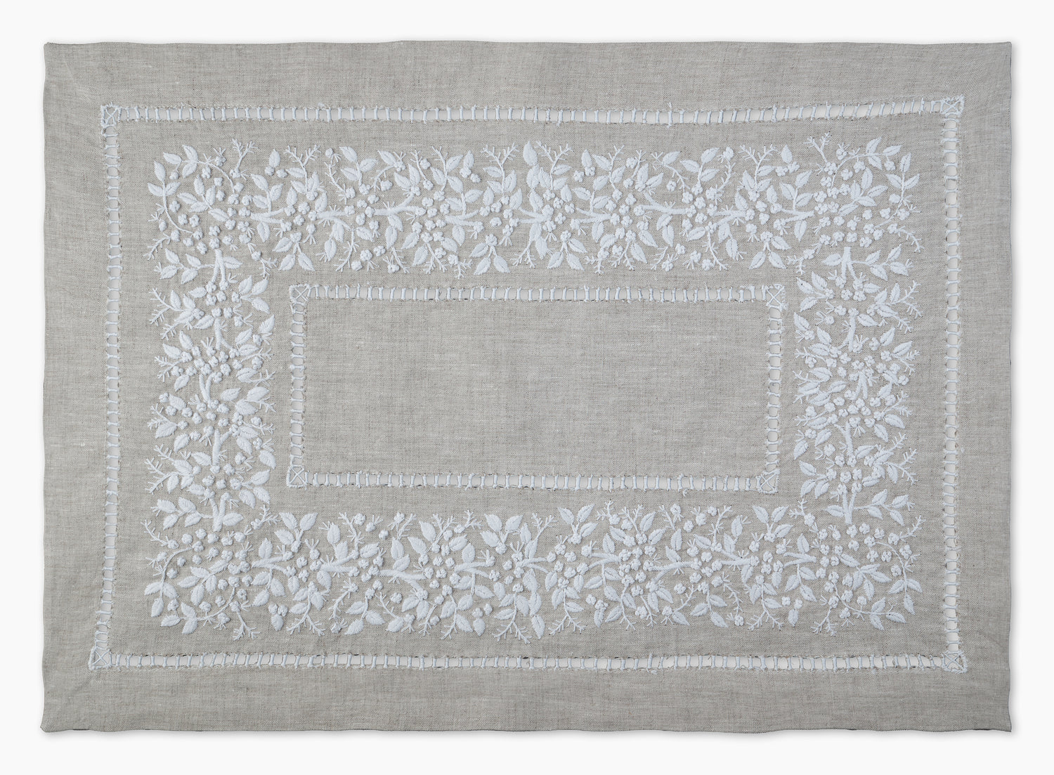 An essential element of the Jardin Classic table, the placemat displays an exquisite French knot floral pattern hand embroidered in white thread on six different colors of pure Italian linen.