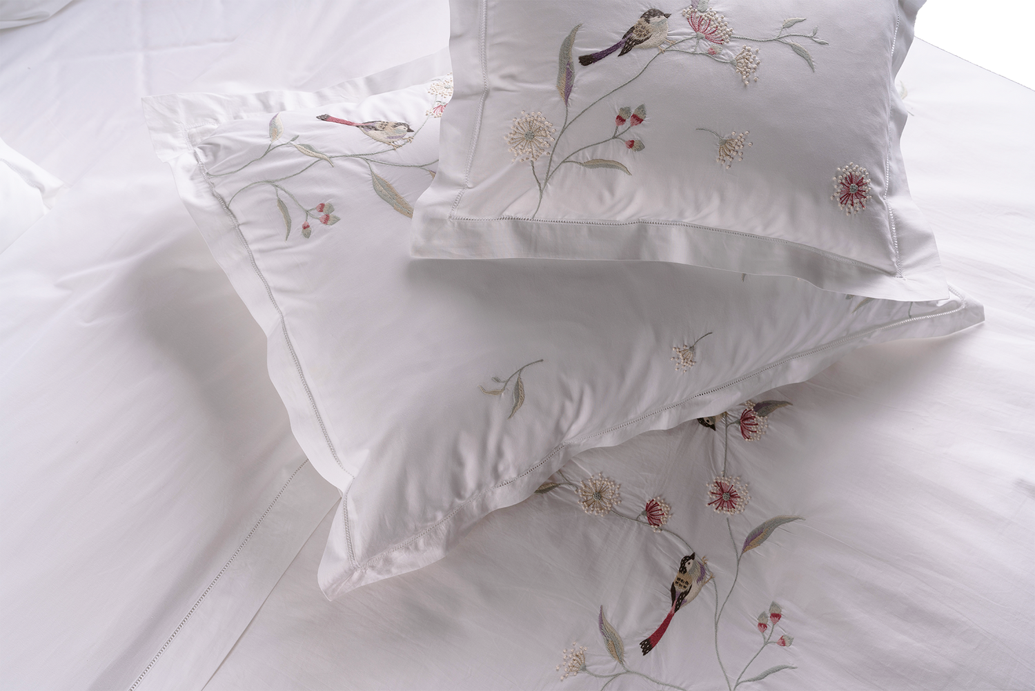 Soft and serene, Birdsong brings an airy touch of nature indoors. Embroidered by hand-guided artistry on pure white percale, this timeless design features feathered friends perched among delicate branches in soft blues and pastels. ...